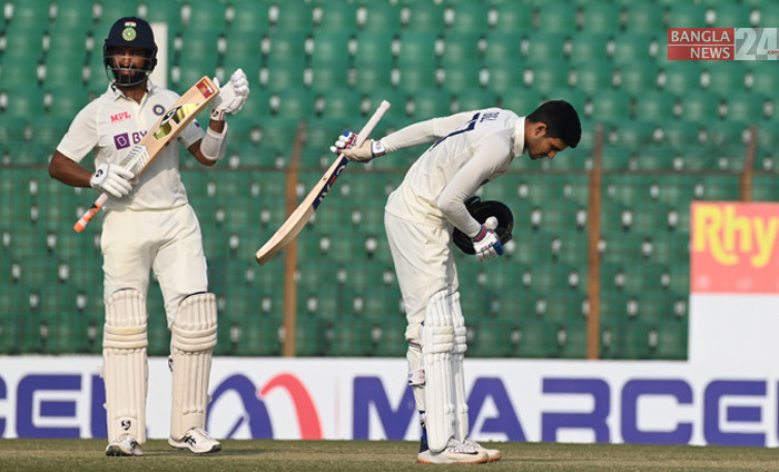 বাংলাদেশের বিপক্ষে প্রথম টেস্টের দ্বিতীয় ইনিংসে সেঞ্চুরি হাঁকানো ভারতের দুই ব্যাটার শুভমন গিল ও চেতেশ্বর পূজারা। চট্টগ্রামের জহুর আহমেদ চৌধুরী স্টেডিয়াম থেকে ছবিটি তুলেছেন উজ্জ্বল ধর।
