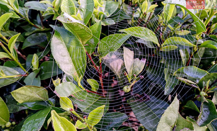 চা পাতার গায়ে বৃত্তাকার বসতি গড়েছে বুনো মাকড়সা। ছবি: বিশ্বজিৎ ভট্টাচার্য বাপন