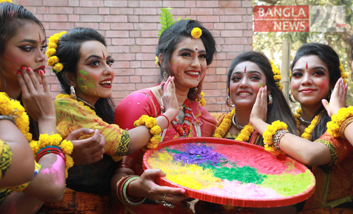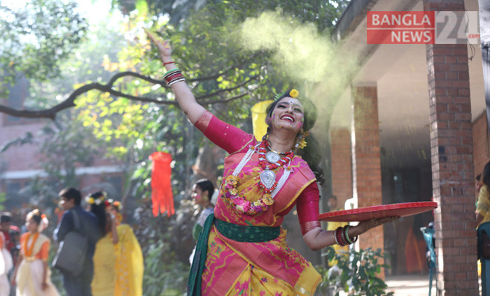 বসন্তবরণ উৎসবে মেতেছেন বরিশাল সরকারি মহিলা কলেজের শিক্ষার্থীরা। ছবি: এন আমিন রাসেল