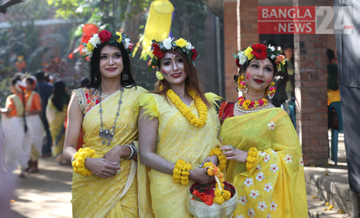 বাসন্তী রঙের শাড়ির সাজে তরুণীরা। ছবি: ডি এইচ বাদল