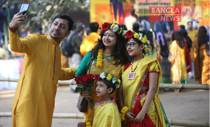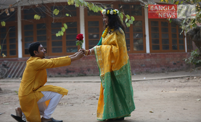 গাঁদাফুলের বাসন্তী রঙেই আজ সেজেছে তরুণ-তরুণীরা। ছবি: ডি এইচ বাদল