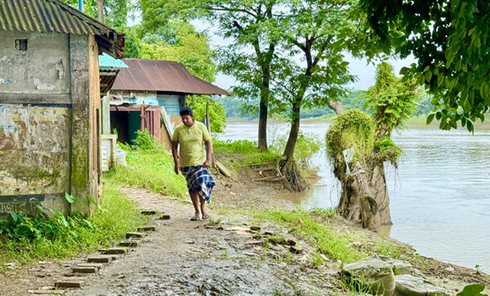 কুশিয়ারা নদীর ভাঙনের কবলে দোকানপাট মসজিদ মাদ্রাসাসহ বসতবাড়ি। ছবিটি সিলেটের বিয়ানীবাজারের ফাড়িরবাজার এলাকা থেকে তুলেছেন মাহমুদ হোসেন।