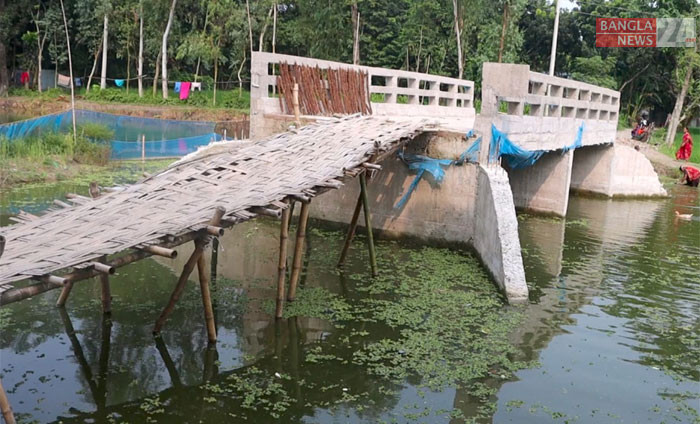 সংযোগ সড়ক না থাকায় বাঁশের সাঁকোর ওপর দিয়ে সেতু পার।ছবি: বাংলানিউজ