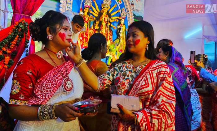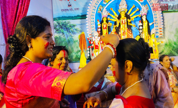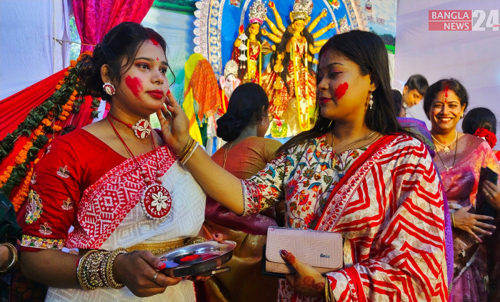 সনাতন ধর্মাবলম্বীদের সবচেয়ে বড় উৎসব শারদীয় দুর্গাপূজা। দেবীর বিদায়ের আগে মণ্ডপে সিঁদুর খেলায় মেতেছেন নারীরা। ছবি: শাকিল আহমেদ