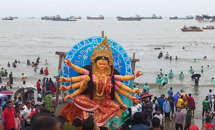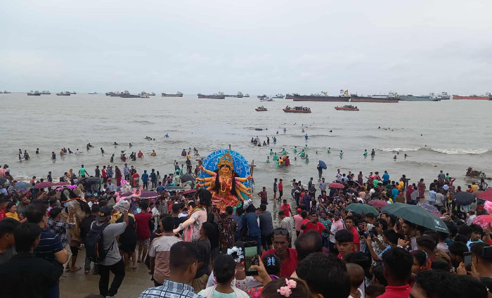 প্রতিমা বিসর্জনের মধ্য দিয়ে সমাপ্তি হলো শারদীয় দুর্গোৎসবের। চট্টগ্রামের পতেঙ্গা সমুদ্রসৈকতে প্রতিমা বিসর্জন করা হচ্ছে/ছবি: সোহেল সরওয়ার