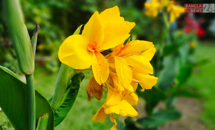 বাগানে ফুটেছে হলুদ কান্না লিলি ফুল। ছবি শাকিল আহমেদ