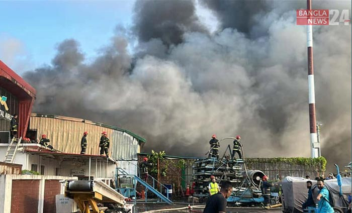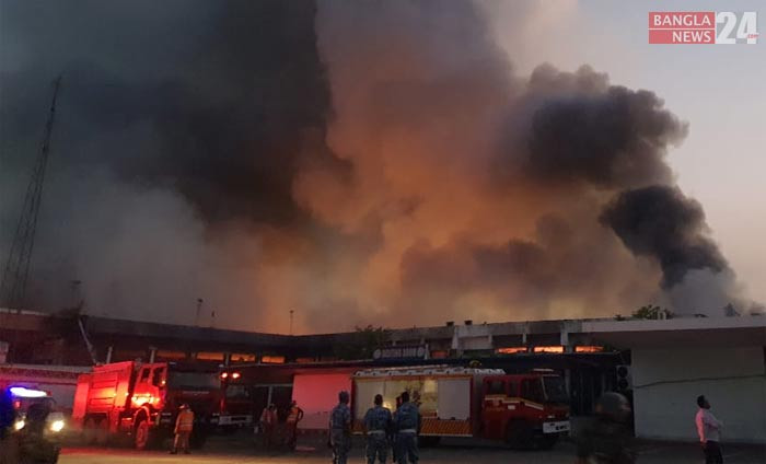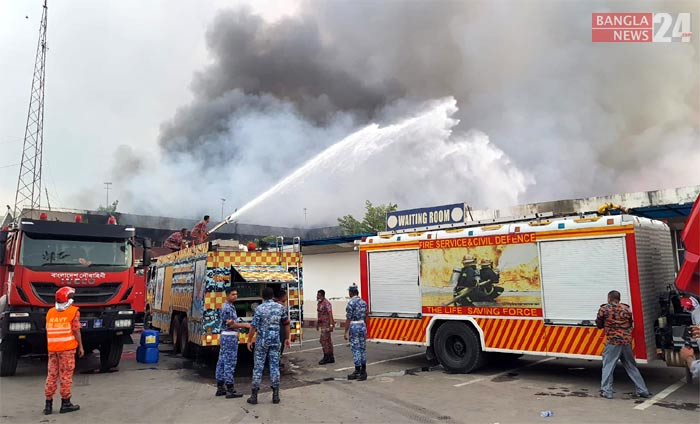 হযরত শাহজালাল আন্তর্জাতিক বিমানবন্দরের কার্গো ভিলেজ এলাকায় লাগা আগুন নিয়ন্ত্রণে কাজ করছে ফায়ার সার্ভিসের ৩৬টি ইউনিট। ছবি: বাংলানিউজ